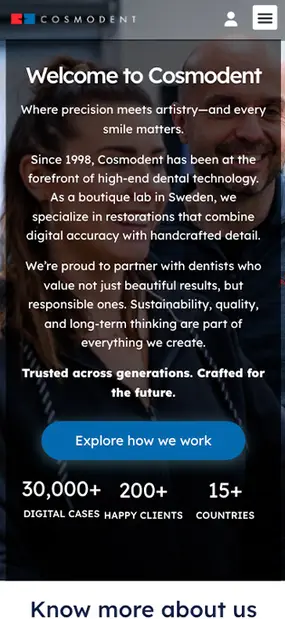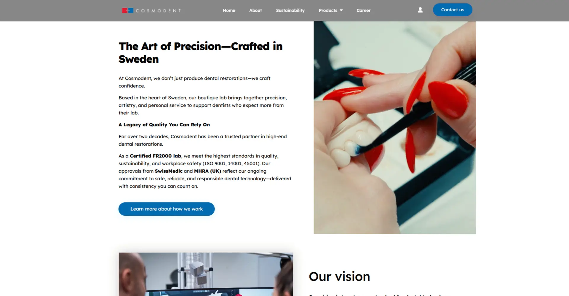 Cosmodent is a Sweden-based boutique dental laboratory crafting high-end crowns, bridges, and implant restorations. With years of experience, plus approvals from SwissMedic and the UK MHRA, they serve dentists who expect exacting quality, predictable turnaround, and personal service.
